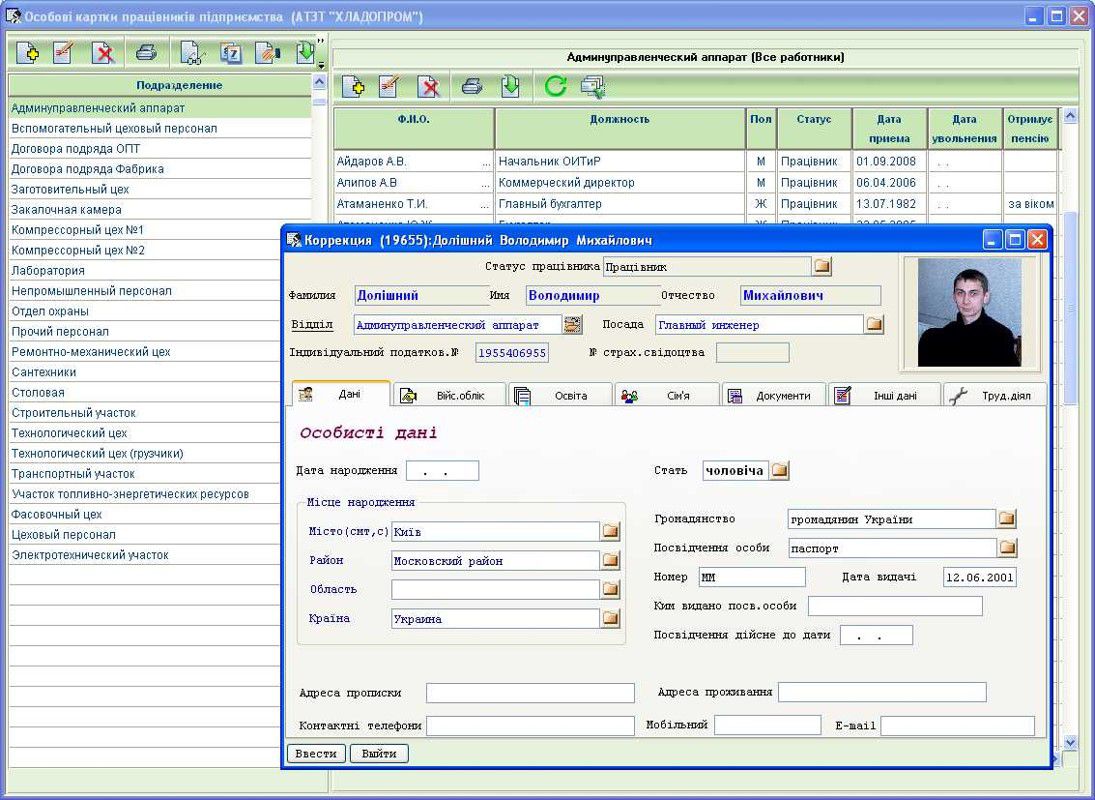 Контур "Відділ Кадрів" забезпечує зберігання будь-якої необхідної інформація про співробітників, а також повністю реалізує кадрове діловодство відповідно до законодавства України. Інтегрований з контуром "Зарплата".