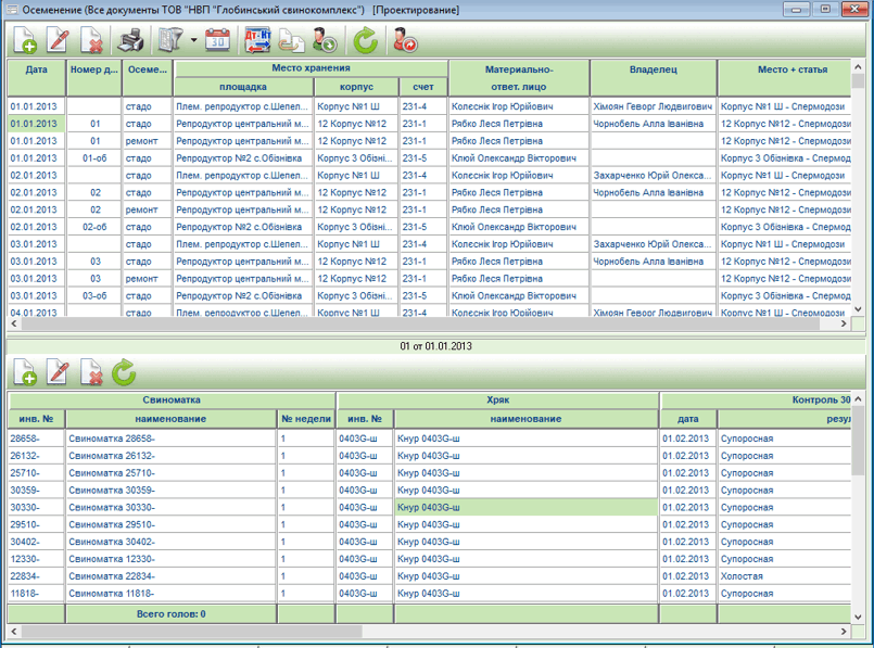 Тут знаходиться поточний статус тварини, а також вся історія її запліднення та опитувань (із зазначенням кількісних показників приплодів).
