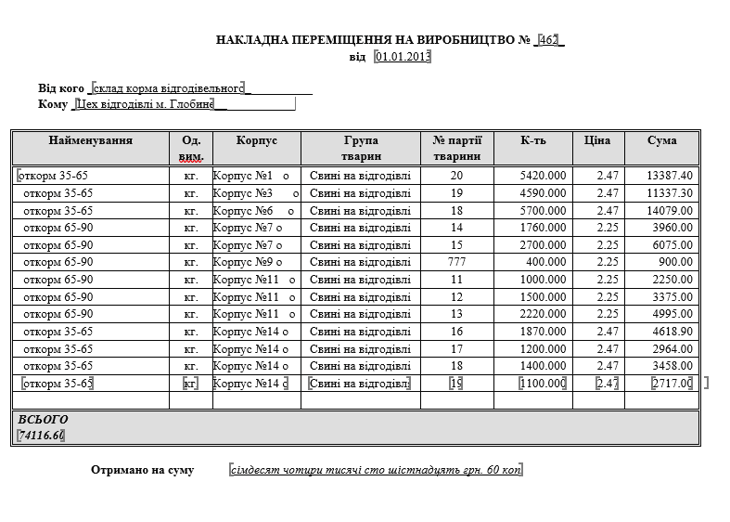 формується автоматично протягом звітного періоду на 23 рахунках на підставі документів основної діяльності. Прямі витрати (корми, медикаменти та ін.) відносяться на конкретну тварину. У разі відсутності такої можливості такі витрати відносяться на спеціальний об'єкт "Витрати в цілому" та розносяться спеціальними алгоритмами