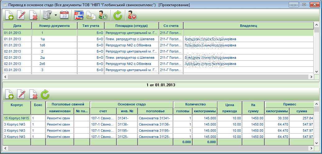 • Основне стадо – тварини основного стада (свиноматки та нури) враховуються як основні засоби, для яких ведеться нарахування амортизації, враховується термін експлуатації та ліквідаційна вартість.